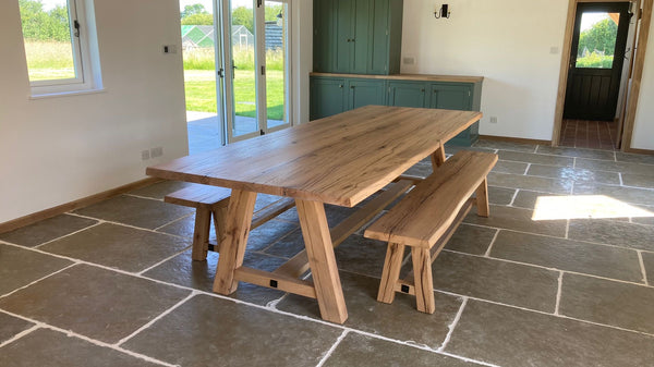 Every dining table we make is totally custom. We don’t mass-produce generic parts or just fix a standard base under a top. Every piece is made just for your order, including the base, so you’ve got good legroom and the right proportions. We even use all the timber from the same batch of wood, so the tones and grain match across the whole table, making everything look more consistent and balanced.