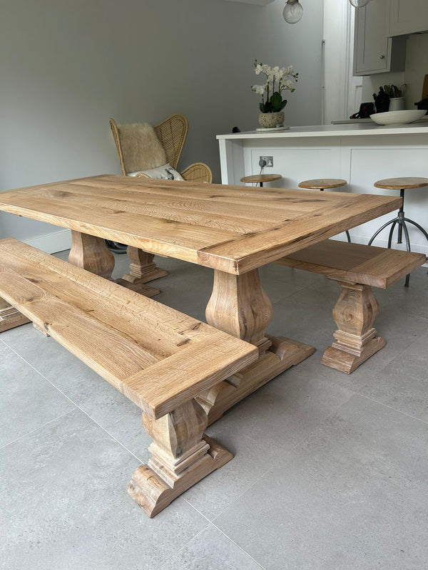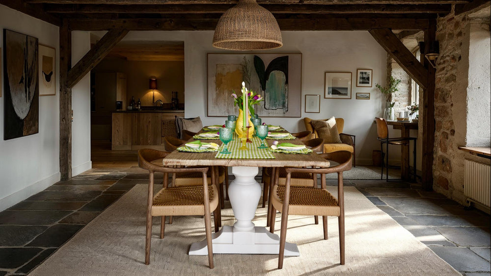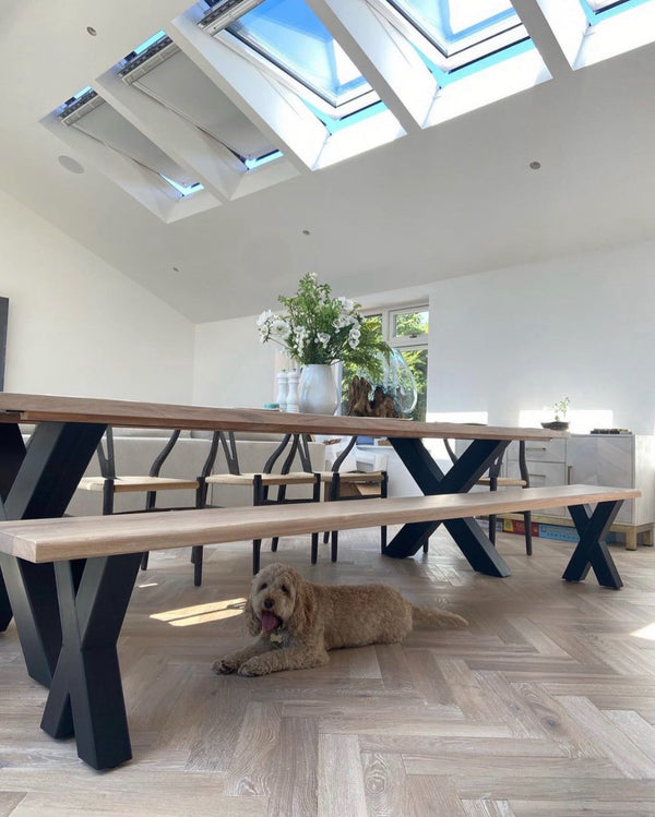 Visiting our showroom is far from an average shopping trip. Nestled between two beautiful reservoirs, our 10,000 sq ft Dutch barn showroom is often described as an Aladdin's cave. We showcase over 30 of our signature tables across eight large rooms filled with furniture, all available for immediate purchase and delivery. You can also customise designs to your preferred size and finish. My dad Paul, brother Justin, or me will be ready to assist if you have any questions. Additionally, you can meet Winnie the pig, Rain the horse, Paddy and Sheamus the Shetland ponies, and our friendly giant dog Barney Boy. After shopping, we can recommend some lovely local spots for