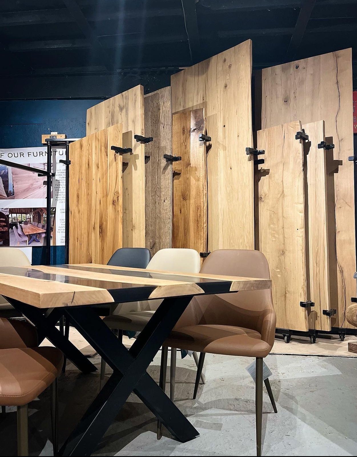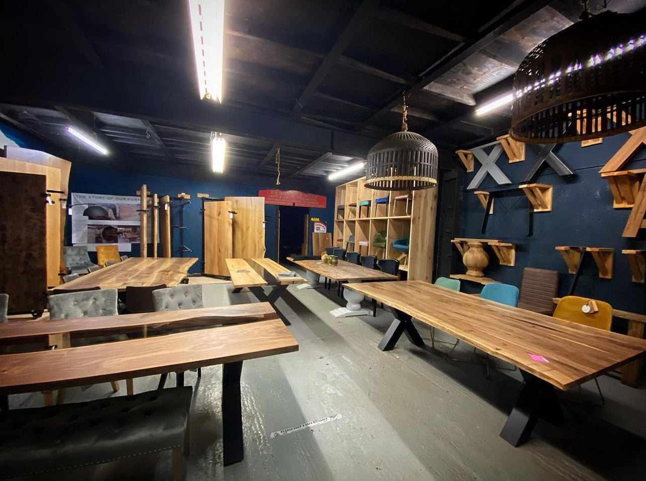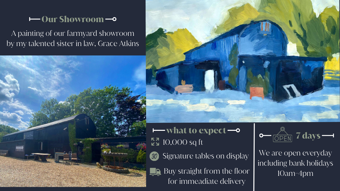Visiting our showroom is far from an average shopping trip. Nestled between two beautiful reservoirs, our 10,000 sq ft Dutch barn showroom is often described as an Aladdin's cave. We showcase over 30 of our signature tables across eight large rooms filled with furniture, all available for immediate purchase and delivery. You can also customise designs to your preferred size and finish. My dad Paul, brother Justin, or me will be ready to assist if you have any questions. Additionally, you can meet Winnie the pig, Rain the horse, Paddy and Sheamus the Shetland ponies, and our friendly giant dog Barney Boy. After shopping, we can recommend some lovely local spots for