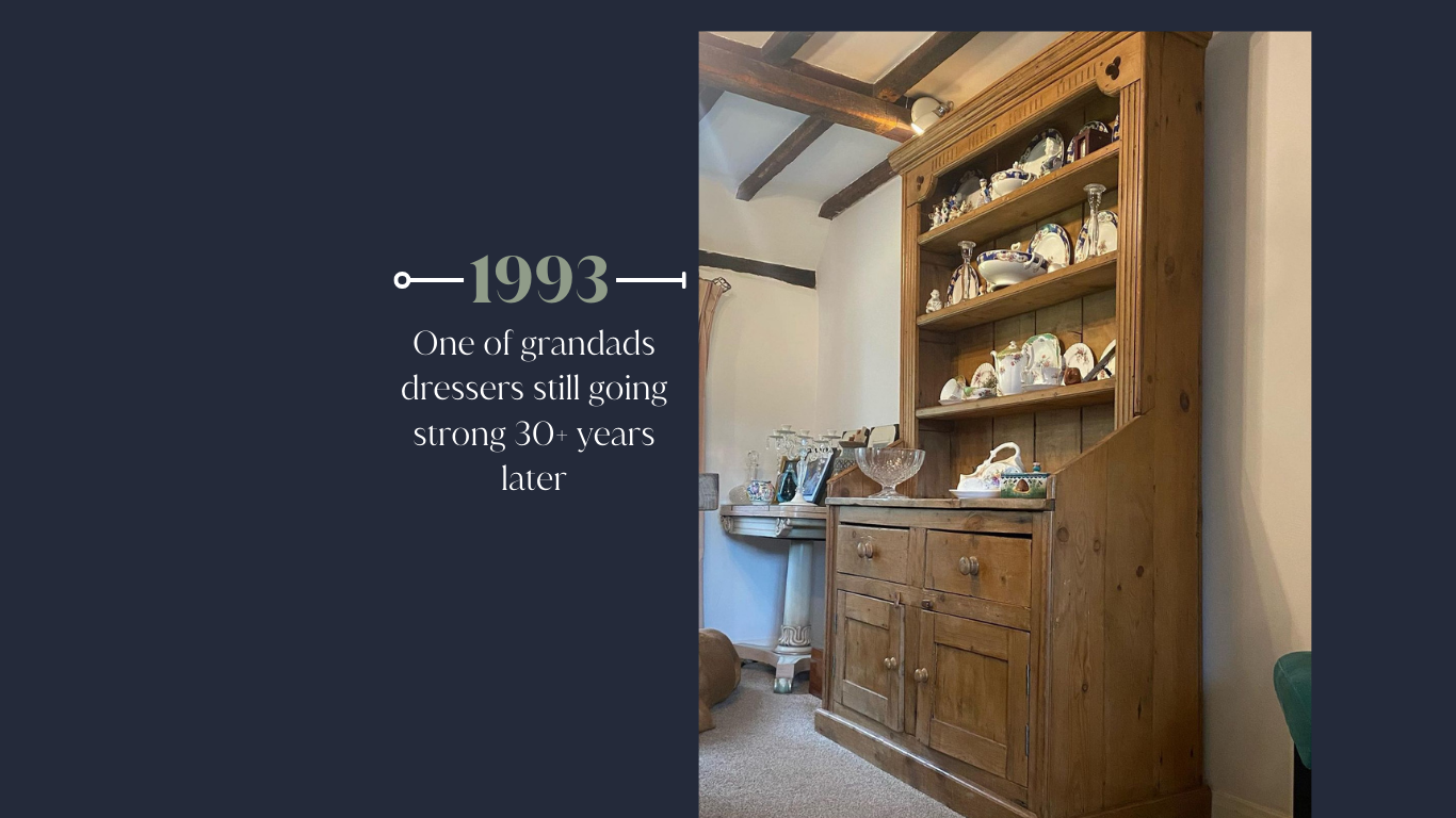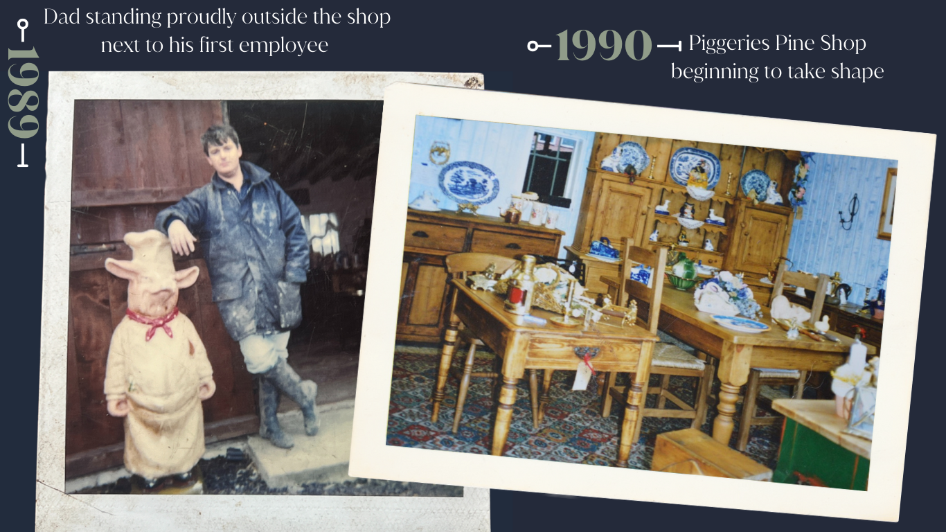 In 1989, our parents, with the help of our grandparents, converted part of an old pig barn into a shop called 'Piggeries Pine.' They started selling country-style antique furniture, mainly sourcing antique dressers from Ireland, which became highly sought after with a waiting list restored pieces. To meet demand, Grandad Ennis began making dressers from reclaimed timber. Even today, customers still cherish the dressers from those early years.
