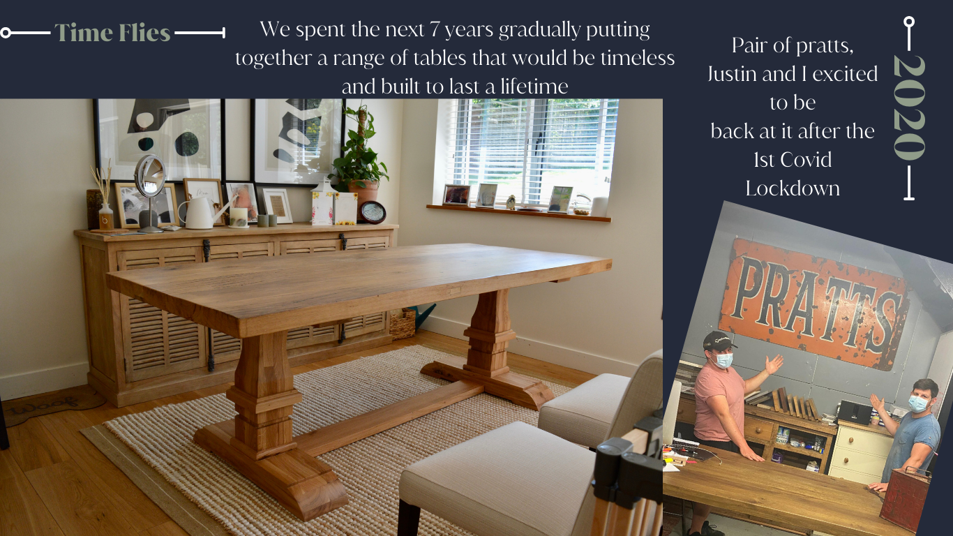 Our table designs quickly gained a stellar reputation for quality. As demand increased, it became too much for just Justin and me to handle. Our parents proposed merging into one company, a move that led to greater success and allowed Dad to cut back his hours—he jokes that working five days a week instead of seven is now part-time! Though much has changed over the years, our ethos remains unchanged: crafting furniture that delights and can be passed down to the next generation. Working with family might sound like a nightmare to some, but we're lucky—we love what we do and couldn't imagine it any other way. We might have one argument a year, but it's because we're passionate, and it rarely lasts more than half an hour before we're all friends again!
