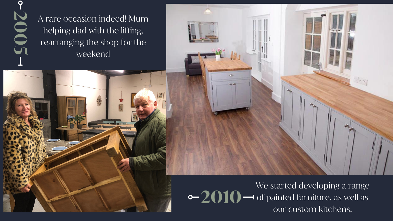 At the turn of the century Mum and Dad had established themselves locally as the go to place for finding country style furniture. Working with 2 different workshops we specialised in waxed reclaimed furniture, later introducing painted pieces including our custom made shaker style kitchens. As a true family business as we began to grow up us brothers were on hand to help our parents, in this case with waxing the furniture and or sittting in the passengers seat with a map on deliveries.