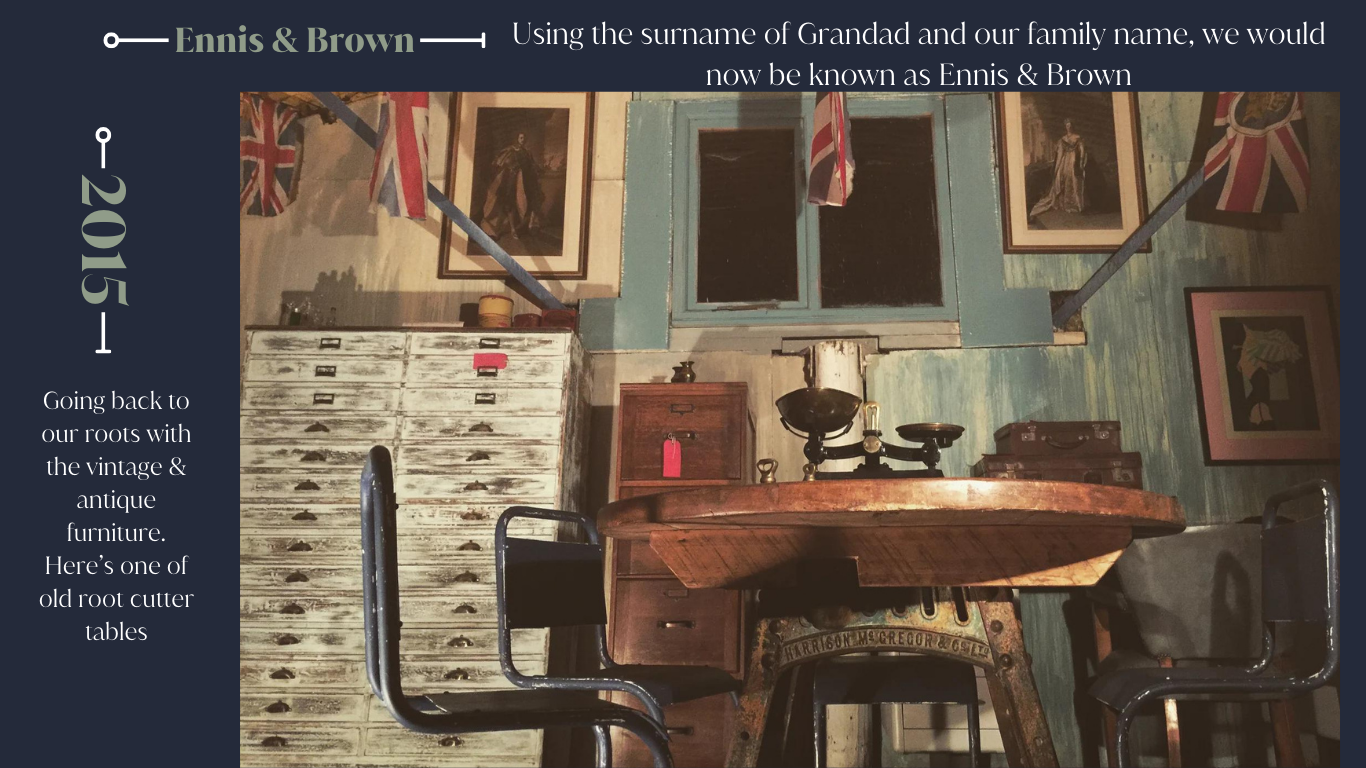 Renting part of the upstairs space from my dad, our vintage furniture business flourished. My brother Justin partnered with me, and we helped with Piggeries Pine, giving our dad a much-needed break. We named our venture Ennis and Brown, honouring our grandparents and parents.