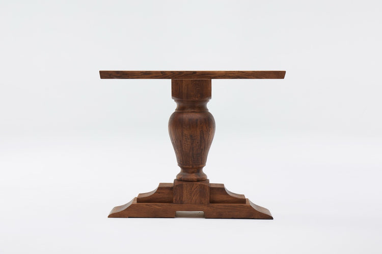 The base makes a confident statement without overwhelming the space. Its sculptural solid oak legs feel substantial yet refined, designed to give generous legroom on all sides without interfering with the knees. Finished by hand and available in a range of paint colours, it suits both classic and modern interiors with ease.